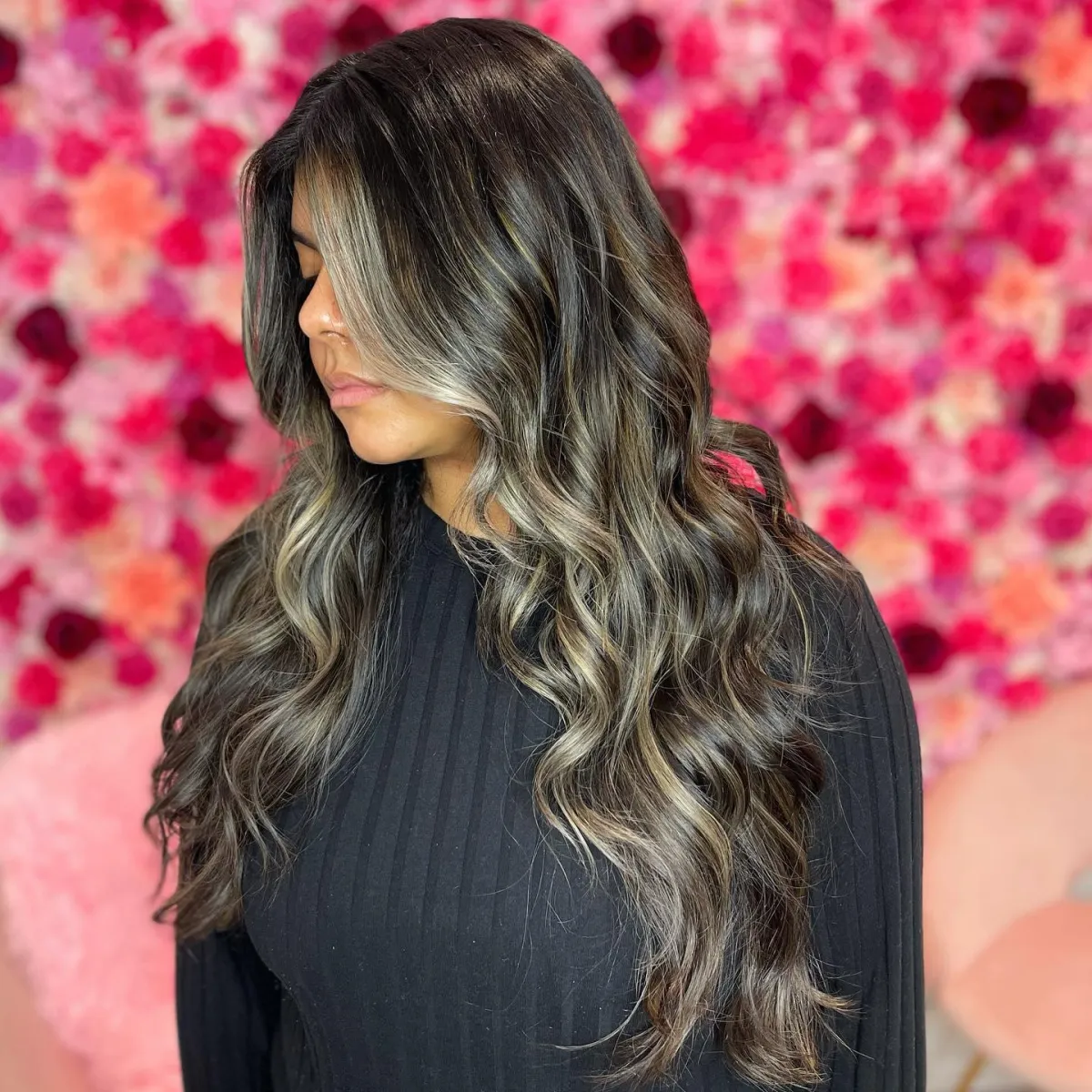 A sleek stylist chair and large wall-mounted mirror with flattering LED lighting