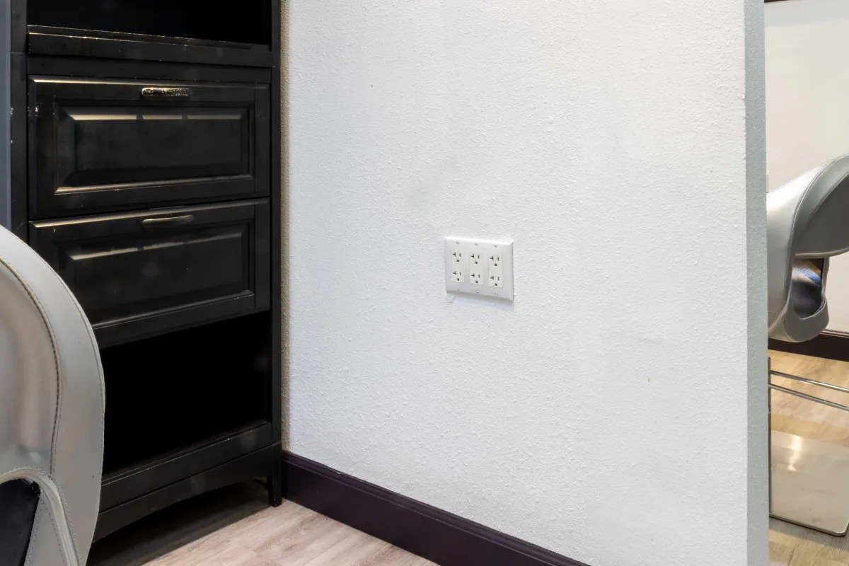 This stylish and functional semi-private booth is thoughtfully designed for beauty professionals who want a clean, modern workspace with everything they need to deliver an exceptional client experience. Booth 2 features a comfortable stylist chair paired with a large wall mirror framed by flattering lighting, ensuring the perfect setup for haircuts, styling, or color services. A mounted Smart TV adds a touch of luxury, keeping your clients entertained while they’re in your chair. For convenience, a sleek round corner table provides space for your tools or decorative touches, while a black cabinet with two spacious drawers offers organized storage. The booth includes three easily accessible electrical outlets, two bright yet soft overhead LED lights, and a partitioned layout that creates a semi-private atmosphere within the salon. With approximately 30 sq. ft. of clean, open space, it’s an ideal environment for both creativity and client comfort. You’ll also enjoy access to shared amenities, including three luxurious black marble shampoo bowls with stainless steel fixtures, a professional black leather salon dryer, and complimentary back bar products (shampoo, conditioner, and towels) to elevate your client experience.